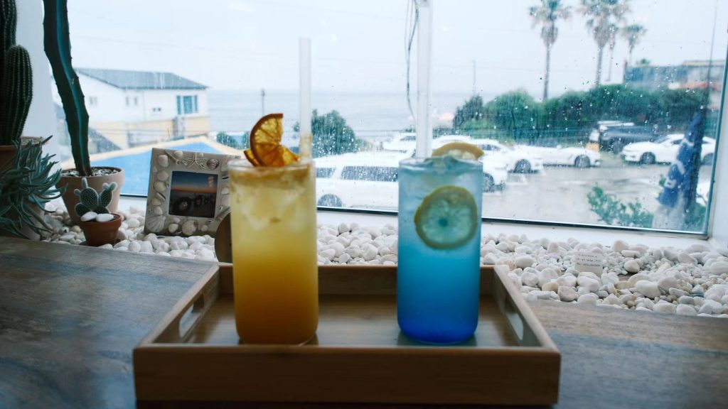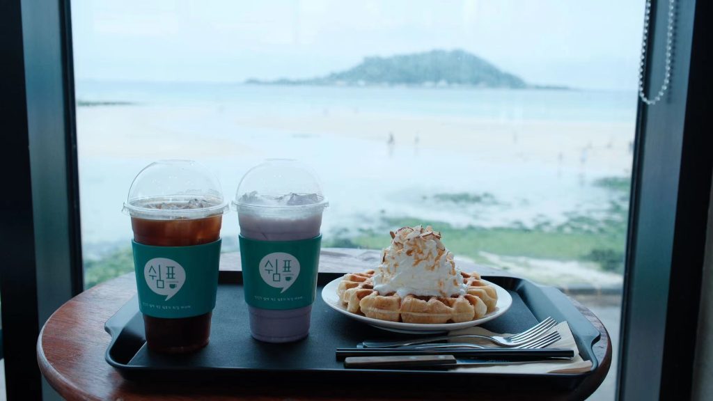 我和炫宝进去点了两杯气泡水,一杯7-8美刀的样子。我选的是济州橘气泡水,炫宝蓝色柠檬气泡水。讲真喝起来都一般般,但相比之下我的橘子汁要更好喝一点。(可能在海边喝汽水主打的是一个氛围感)