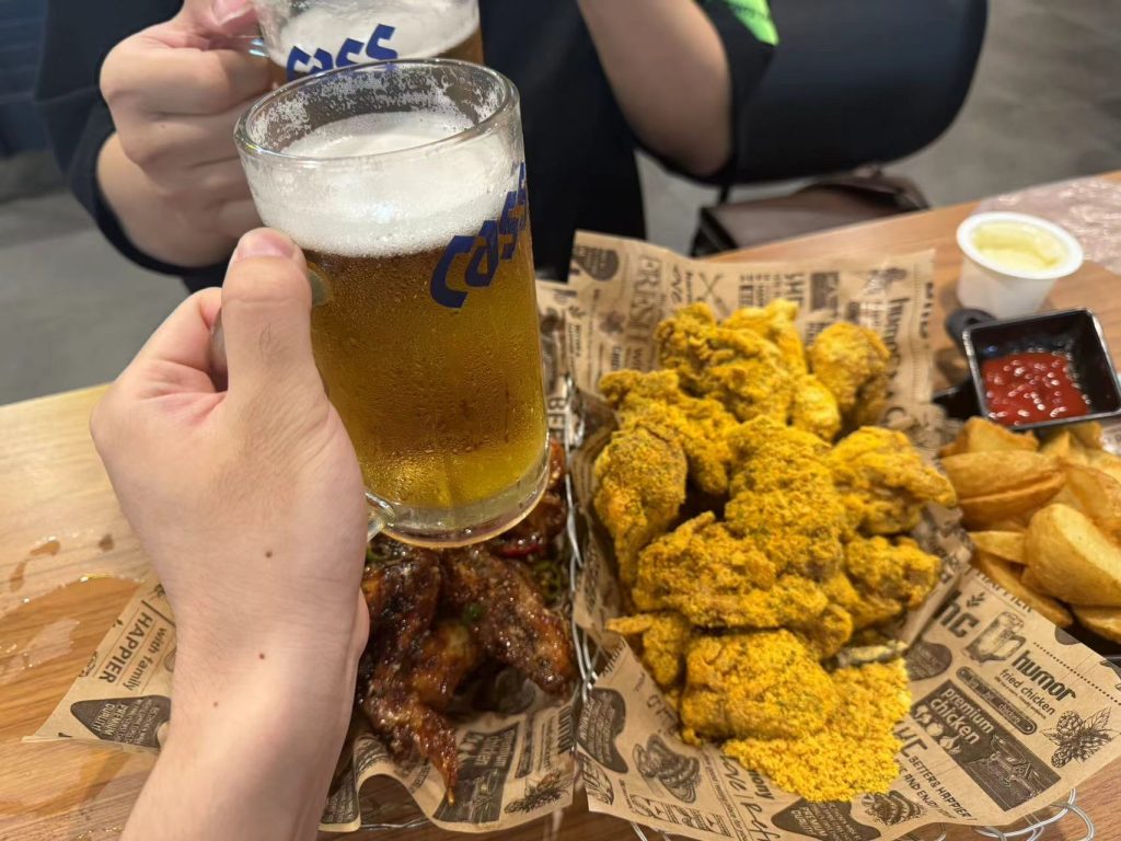 点的是两份500cc的啤酒,炸土豆块和两份炸鸡。一路上也没怎么喝水就直接开始喝酒了。该说不说这个啤酒不是那种气很多会打嗝的啤酒,就是怎么说呢——入口即化好了。