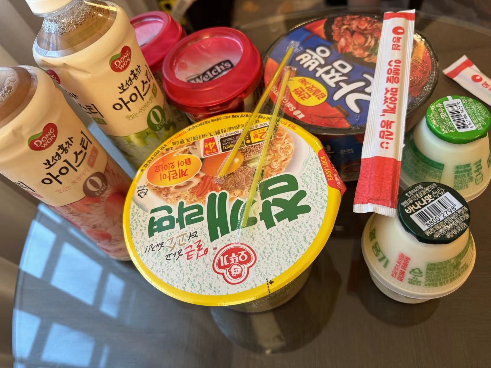 买的是很好喝的香蕉牛奶,朋友推荐的杯装的苹果汁特别好评!炫宝的火鸡面看着就很辣很辣,相比之下我的营养拉面就寡淡了许多。后面买的两瓶0卡的饮料也很不错。