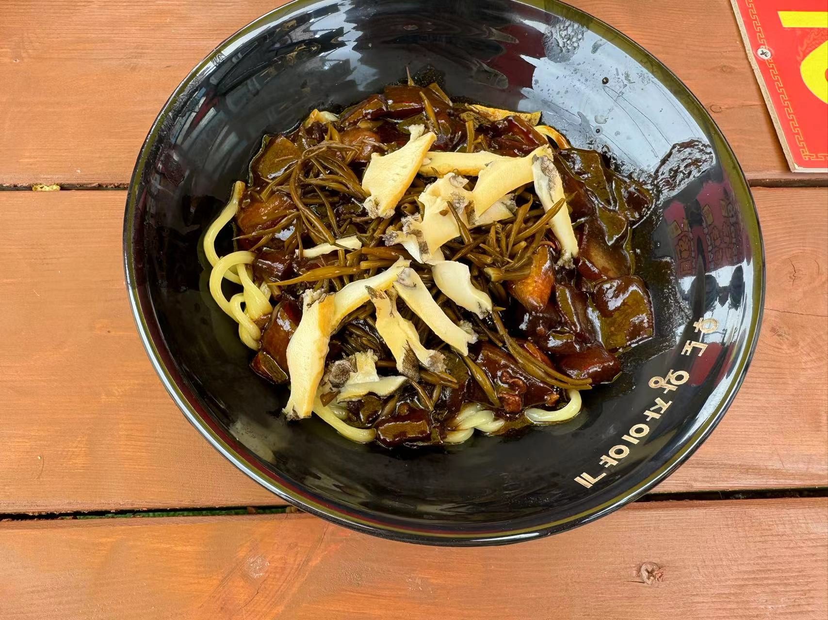 这个炸酱面很有海边的那种风味(怎么说呢,就是有股子海鲜味然后有点点咸——酱油很多),吃起来还不错。里面这个蔬菜是啥我不知道,这个黄色的应该是鲍鱼干?总之就一股脑全部炫完了。就是分量属实有点小了——可能是坐了一个半小时的公交然后坐船有点累了,就有点饿。