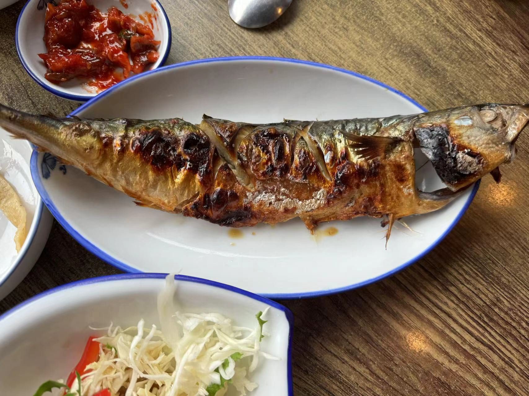 点满三个菜送一条烤青花鱼,这个烤青花鱼真的是我最爱的食物了。。。