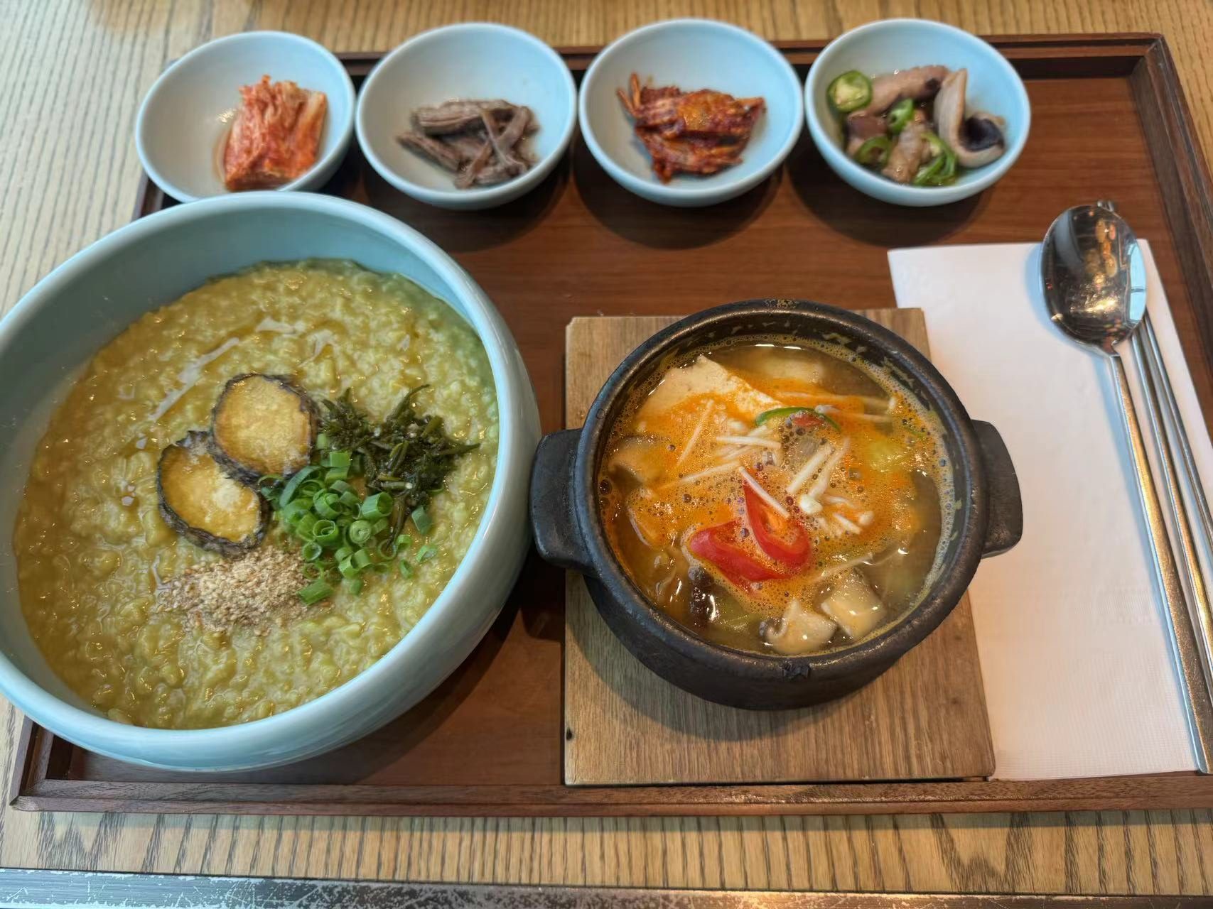 第三天的早饭是在君悦的38层观光餐厅吃的,点的是海鲜鲍鱼粥。对于我这种平时早饭吃的比较少的人来说,这么一大碗粥属实有点子多了。而且这个鲍鱼口感也一般般(明显没有前一天吃的烤鲍鱼来的好吃),所以这份早餐显得性价比就很一般——可能是38楼的济州市区全景风光的加持,让这份早餐要到了2w韩元。