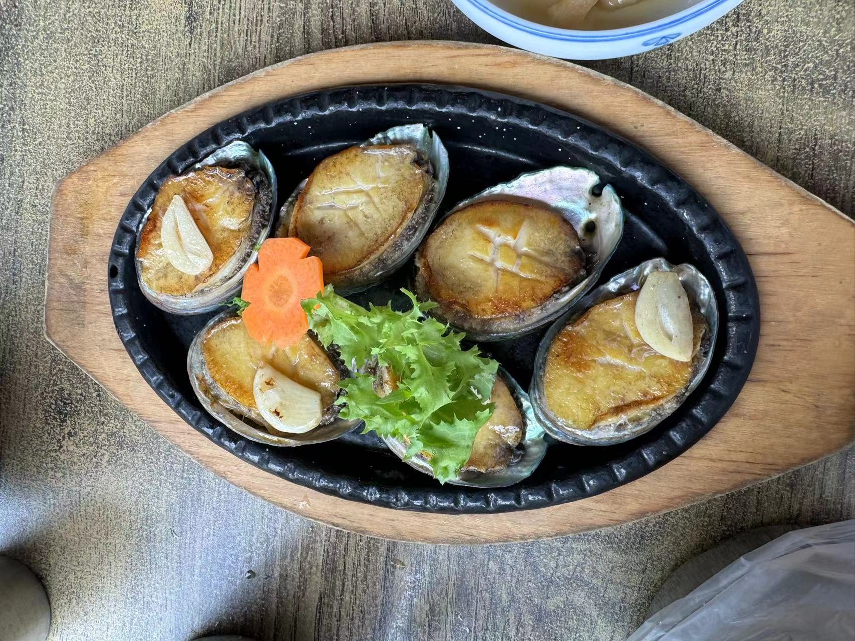 这个烤鲍鱼很奈斯,真的是刚刚烤出来的时候低下还在滋滋冒油。剔掉鲍鱼下边的脏东西就可以一口一个了(虽然很烫)。咬下去肉质很细腻很嫩还带着蒜香的。