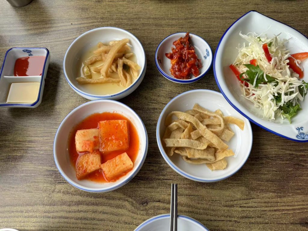 似乎在济州岛吃饭每一家上来都会拿上各种各样的泡菜,萝卜菜,章鱼,鱼豆腐条?还有一个不知名的蔬菜。单吃我感觉好咸啊。
