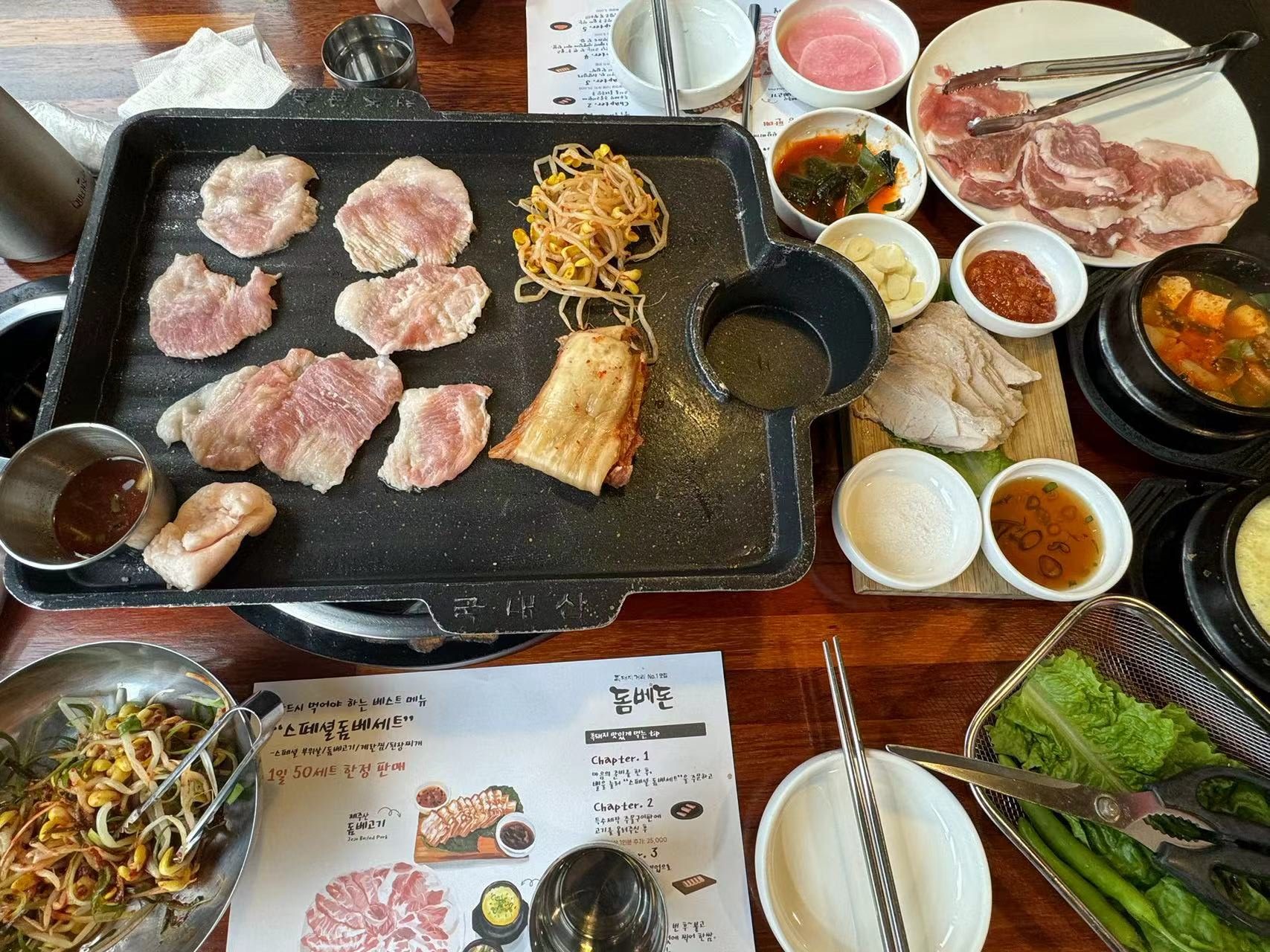 逛完牛岛后面就是回到济州岛,在酒店旁边选了一家烤黑猪肉的餐厅——这个餐厅就是说没人会中文,他们的英语我也是很难理解(带着韩国口音的英语maybe)——只有店长的英语还算正常hhh