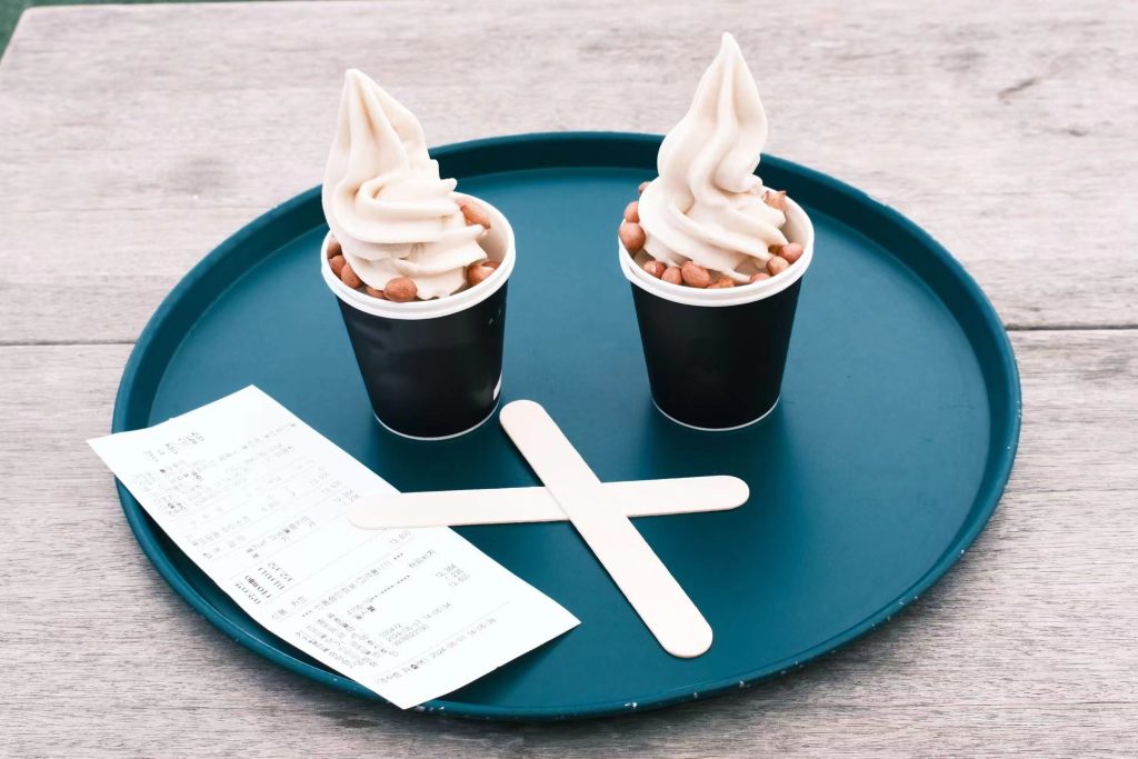 花生冰淇淋就是冰淇淋上面放了花生,倒不是花生口味的冰淇淋。冰淇淋的味道emm应该是可可味的,一样还是量好少啊,三两口就吃完了。