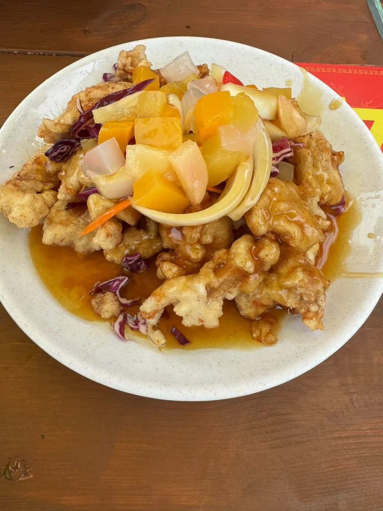 这个水果小酥肉上面的水果好像以前做那种生日蛋糕里面放的水果块,有好多种的水果也很甜(这很符合江阴人的口味了)。小酥肉也是酥酥脆脆的,就是量好少。