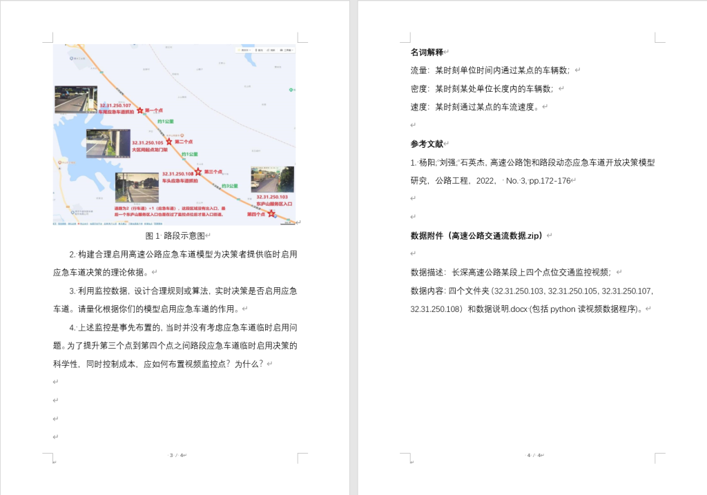这是一道开放性很强的题目。主要是针对高速公路拥堵的状况,视情况开启应急车道以缓解拥堵。题目给定了位于南京的一段高速公路的视频监控录像,从视频录像中挖掘信息——车流量、车流密度、车流速度等信息,通过建立一定的数学模型,判断未安装录像的区域的车流情况。
