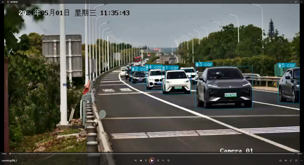 题目困难的一个点就在于,在给定的视频材料中提取关键信息,即上述的三个信息。由于视频是经过10倍速的,用双眼观察肯定是个办法,但是非常消耗时间。(但是后面我们真就用观察的方法进行的……)既然是数学建模的试题,肯定是要通过视频目标识别来进行的。这里感谢 @花开再相遇 提供的视频教程,使用Python里的一个Carcount的程序包,识别视频中的车辆,具体效果如图: