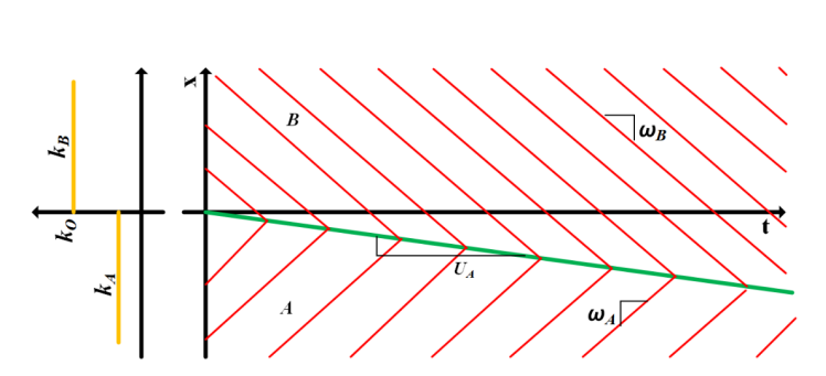 由于波 B 代表的是一队行驶在前的慢车队,而波 A 是一队行驶在后的快车队。快车队会赶上慢车队,即波 A 会赶上 B,从而形成冲击波。因为这是一个黎曼问题,冲击路径是一条直线,冲击波的速度由 Rankine-Hugonoit 的跃变条件所决定: