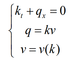 LWR 模型具体表达式如下式所示,公式满足交通流守恒定律,称为 LWR 交通流偏微分方程。
