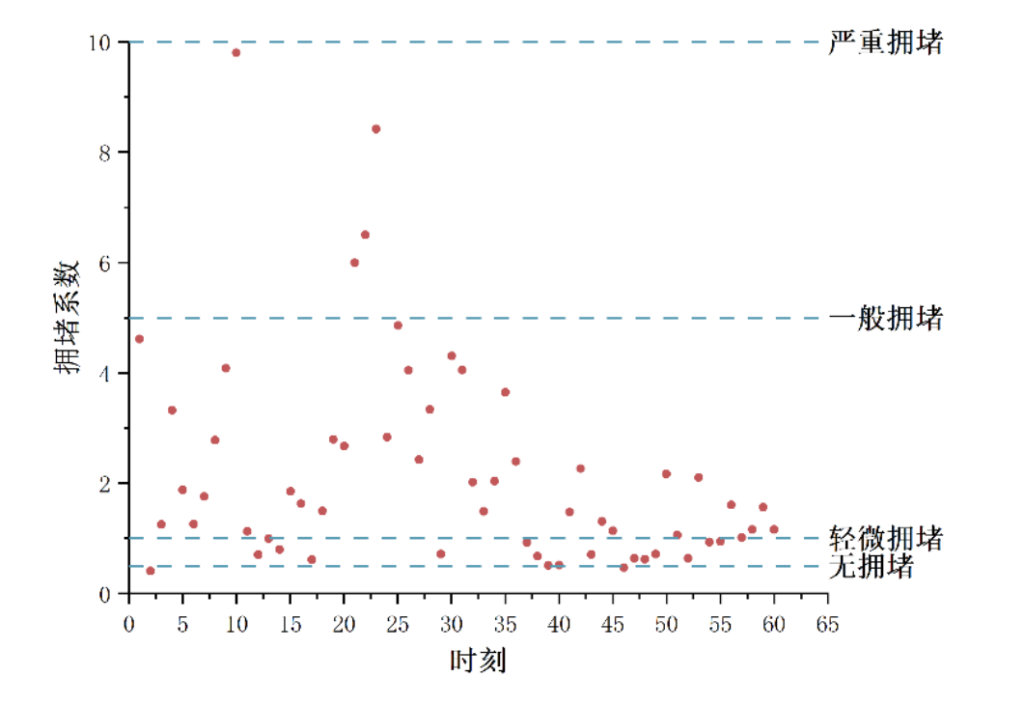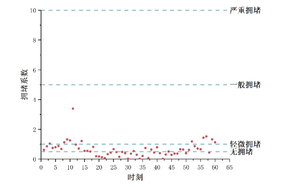 同样的,如上图所示为另一观测点的拥堵系数点分布图,根据所测得的数据,结合拥堵系数模型计算,我们发现在该观测点的拥堵系数离散程度较大,且该观测点的拥堵系数基本处在大于 1 的区间内,即道路状态处在一般拥堵下,部分时刻道路处在严重拥堵的状态下。