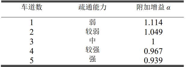 鉴于高速公路路面情况良好,sb在本模型中取取 0,μ 在本模型中取为 1。由附加的道路疏通模型,根据国家高速公路路面宽度和小轿车的平均车宽,计算出在不同车道下的疏通附加增益 α,并将该附加增益在车道数等于 3 的情况下进行归一化处理,得到下表的数据。