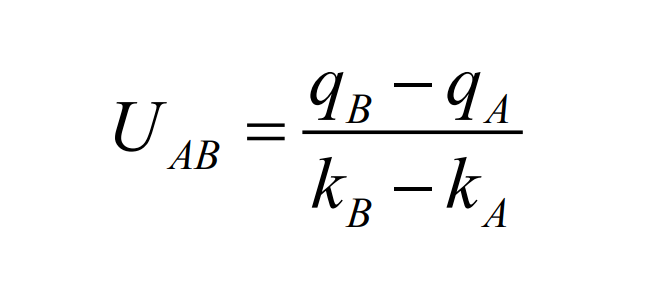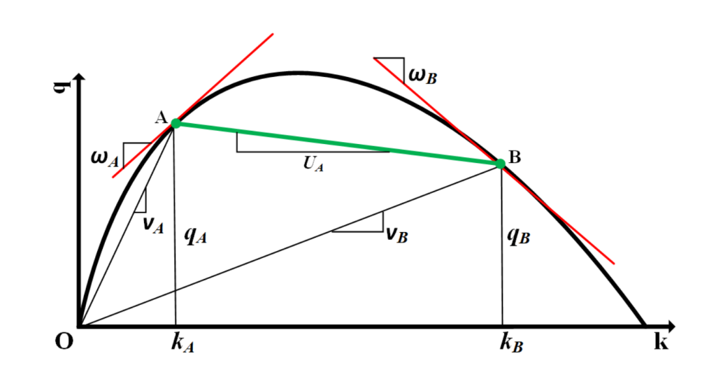 如下图所示,这个值恰巧是连接 q-k 曲线上点 A 和点 B 的弦的斜率。另外,根据初始条件我们已知冲击路径从时-空图的原点处开始,因此冲击路径就是从原点作的一条斜率为UAB 的直线。组成两个运动波的特征线都终止于冲击路径。这样,我们就用图解的方法画出了问题的冲击波解。