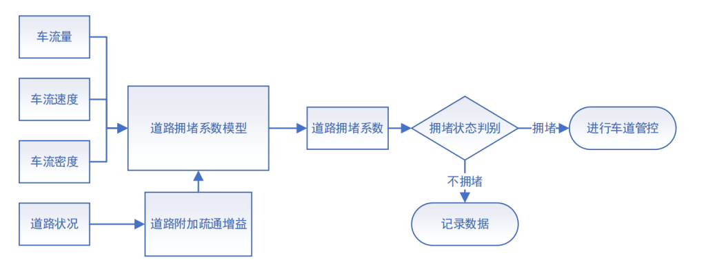 基于路段部分的车流量、车流密度、车流速度等信息,构建了交通状态评价算法,基本评价算法如下:
