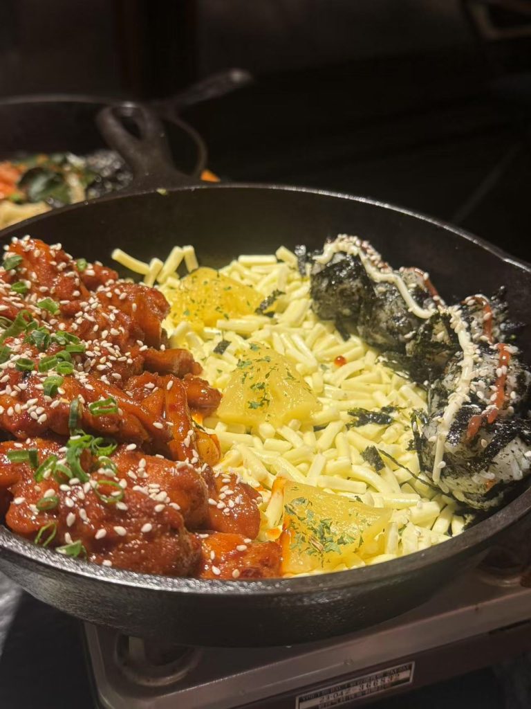 最后一份是韩式炒鸡,店员把鸡肉米饭和芝士炒在一起,看起来真的是满满的食欲(编辑Blog的大晚上真的很容易看饿)这个芝士真的很足很足,吃起来是鸡肉都被芝士裹满的感觉,超幸福了!