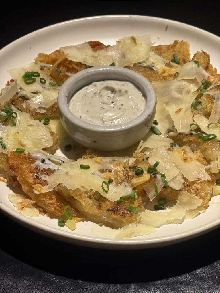 第一份上的是芝士土豆饼,真的很爱一切有关土豆的食物——土豆饼的表面炸的很酥脆,中间是黑松露酱。刚端上的土豆饼还冒着热气,土豆和酱汁一起在舌尖融化真是很满足了。